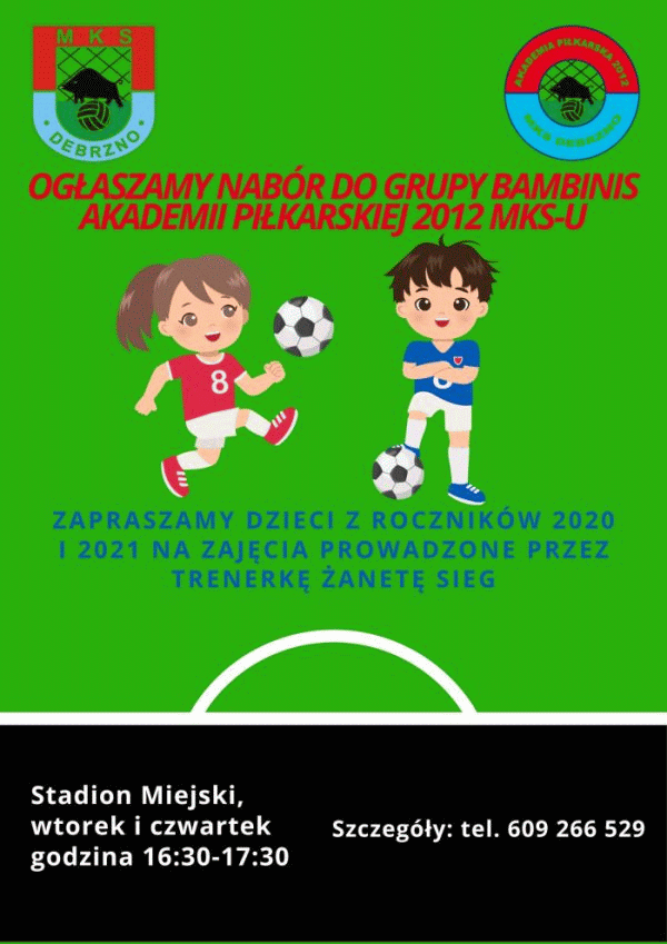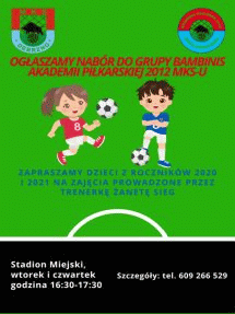 grupa VII (roczniki 2010, 2011 i 2012, juniorzy B2), trener BARTŁOMIEJ LICA; środa 12 listopada godz.19.00-20.00 boisko Orlik przy Stadionie Miejskim